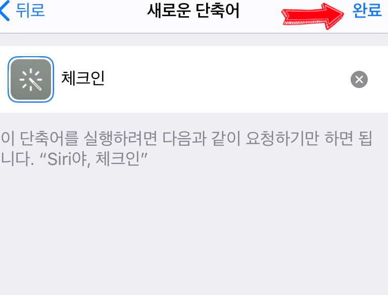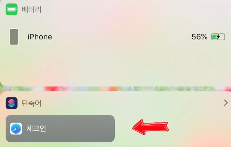 아이폰 단축어탭에 체크인 바로가가가 설정되어 있는걸 확인하실 수 있어요