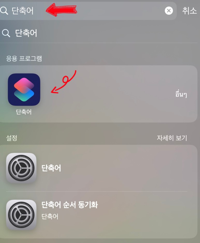 네이버 큐알코드 만들기 에서 봤던 저 체크인페이지 (복사)=> 아이폰 화면을 켠 다음 좌측에 있는 검색어 화면으로 들어 가신 다음 "단축어"라고 검색해 봅니다. 그럼 아래와 같이 응용 프로그램 하단에 보시면 네모난 어플모양으로 된 박스가 보이게 되는데 여기로 들어가 봅니다.